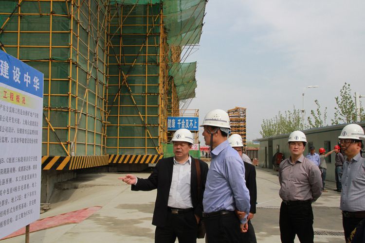 410下午,揚州市副市長聞道才在揚州市建設局成自勇副局長、唐朝文處長和廣陵區、邗江區、江都區副區長等的陪同下,赴我司合肥東方藍海B、C組團三標段項目參觀考察。公司副總經理陸俊、公司副總經理、惠州區域公司總經理華恒榮向來訪領導簡要介紹了江蘇華建在安徽市場的發展戰略及東方藍海B、C組團三標段項目的施工情況。