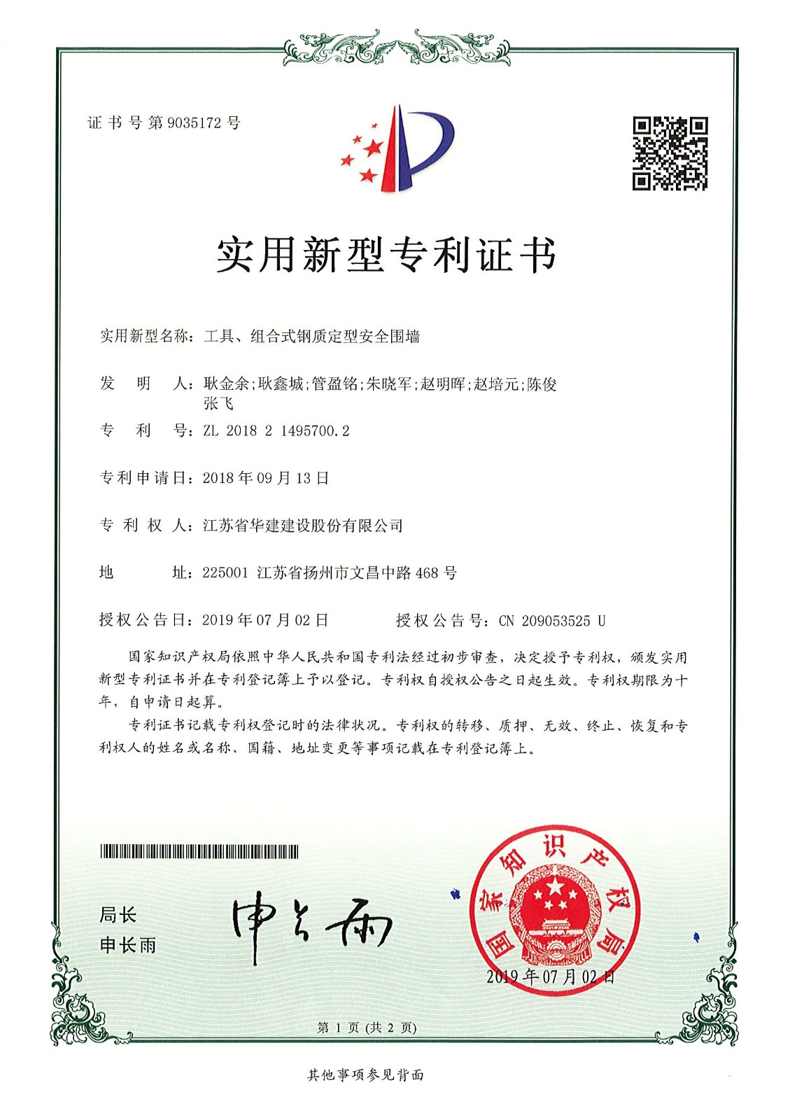 實(shí)用新型專利證書(工具、組合式鋼質(zhì)定型安全圍墻)