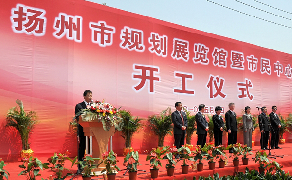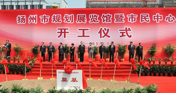 開工儀式由副市長陳揚主持,市政府副秘書長、建設局局長王駿對項目具體情況作了介紹,建工控股董事長陸金龍代表建設代理方作表態發言,他提出要抓好三個方面的重點工作,一是舉全系統之力組建項目管理的精英團隊,著力體現揚州建筑大市的實力和水平。二是高起點規劃,高標準建設,著力打造體現揚州文化底蘊、彰顯現代個性的標志性建筑。三是切實加強組織領導,著力展示建工系統干部職工的精神風貌。市長謝正義代表市委、市政府致辭,他指出這個項目的建設對進一步提升城市基礎設施建設水平,完善城市功能,提升城市品質,建設“創新揚州、精致揚州、幸福揚州”,都具有深遠和重要的意義。他對該項目提四點要求:一要深化方案,用城市客廳的理念,把這座建筑打造成揚州新的建筑標桿、節能的標桿;二要嚴格管理,確保安全施工和工程質量,爭創“魯班獎”;三要精心組織,確保工程進度,力爭2011年底竣工;四要堅持原則,確保工程廉潔,大家平平安安。希望參與建設的各單位統一思想、明確目標,努力把揚州市規劃展示館與市民中心建設成優質工程、品牌工程、民心工程,為建設精致揚州增添一抹亮麗的風景線。