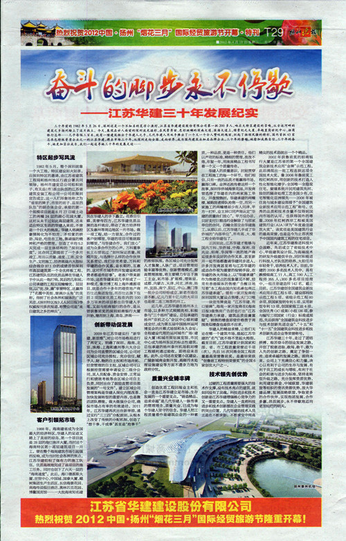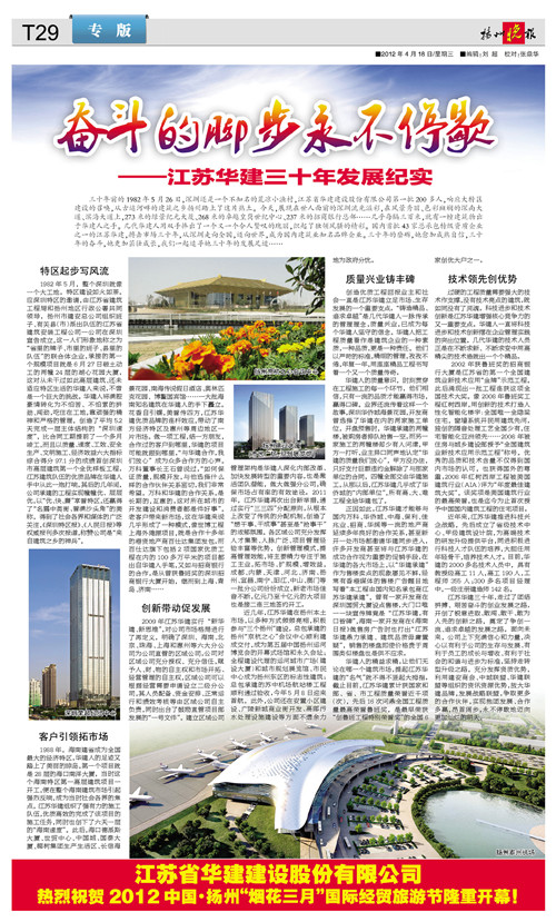 《揚州晚報》專版刊發公司三十周年宣傳文章 時間:2012-04-19 6266 4月18日,《揚州晚報》T29版刊發專版文章《奮斗的腳步永不停歇——江蘇華建三十年發展紀實》,從公司起步、市場開拓、創新發展、質量與科技等各個層面,介紹了公司三十年的奮斗歷程、綜合實力和發展業績。