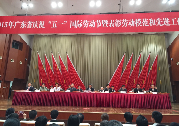 4月27日上午,2015年廣東省慶?!拔逡弧眹H勞動節(jié)暨表彰勞動模范和先進(jìn)工作者大會在廣州白云國際會議中心舉行。廣東省委書記胡春華、省長朱小丹等領(lǐng)導(dǎo)參加會議。