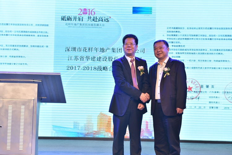 答謝大會上,王宏董事長代表江蘇華建與花樣年地產集團總裁劉宗保簽署了雙方戰略合作框架協議,同時,江蘇華建以與花樣年地產集團合作時間最早、合作期限最久贏得了本次大會新設的唯一“鉆石級供應商”最高大獎,蔣超代表公司上臺捧回獎杯證書。