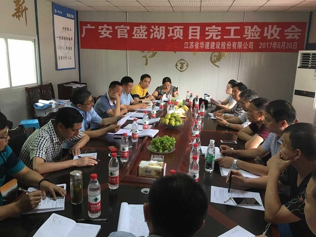 華建第一壩——官盛湖大壩工程順利通過完工驗收 時間:2017-07-03 3977 6月30日上午,華建首個水利項目——官盛湖大壩工程完工驗收會在項目會議室召開,廣安官盛新區管委會副主任蔣成文主持會議。經項目勘察、設計、監理、區住建局、質監站、水務局、發改局、財政局等單位和業主現場代表實測檢查、分別總結匯報后,一致同意工程驗收合格。 官盛湖大壩作為一項以城市景觀為主、兼有防洪功能的綜合性水利工程,主要由樞紐工程、泄洪渠工程組成。官盛湖湖區總庫容987.73萬立方米,壩頂長349米,最大壩高48.5米,壩體填筑總量達157.93萬方。