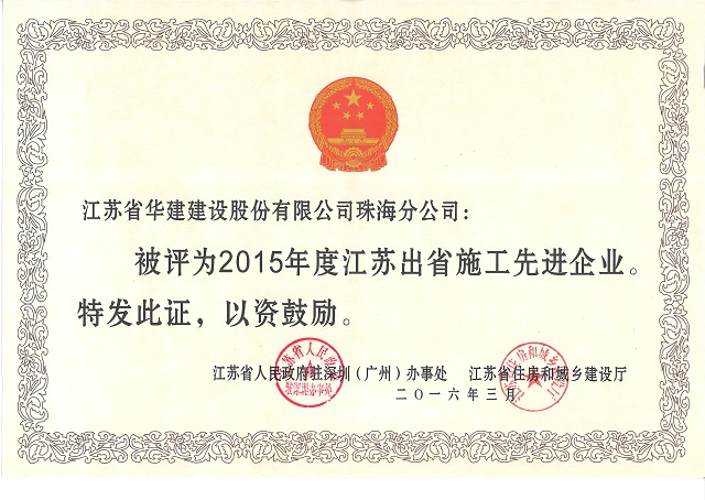 3月24日,江蘇省人民政府駐深圳(廣州)辦事處和江蘇省住房和城鄉建設廳在廣西南寧召開2016年度江蘇建筑業南方區工作會議,珠海公司被表彰為“2015年度江蘇出省施工先進企業”,公司副總經理、總會計師馮喜平榮獲“江蘇出省施工優秀企業經理”稱號,公司副總經理、總工程師周學軍榮獲“江蘇省出省施工優秀建造師”稱號;徐平、陳榮被評為“江蘇省進粵、桂、閩、瓊施工質量安全先進個人”;趙永濤被評為“江蘇省進粵、桂、閩、瓊施工經營財務先進個人”。