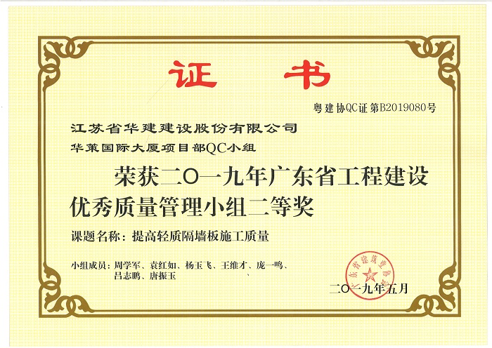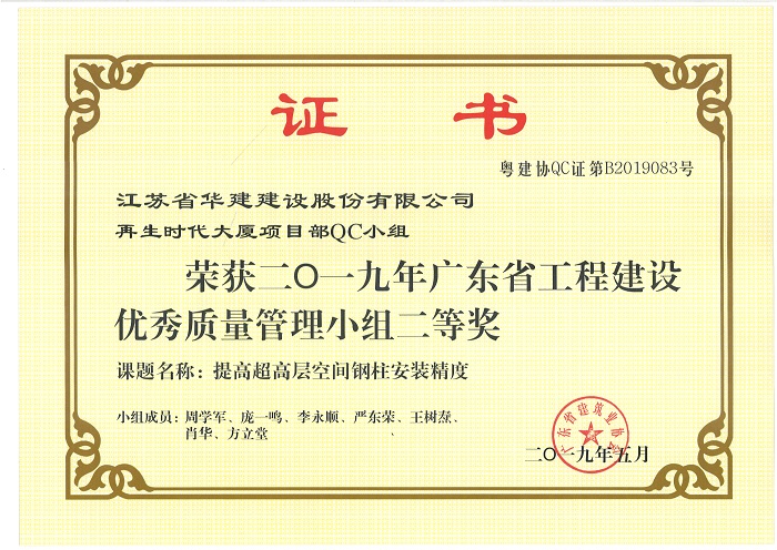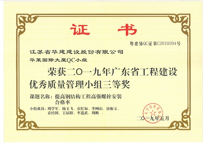公司新添4項省級工程建設優秀QC成果 時間:2019-07-11 4029 近期,廣東省建筑業協會發文公布了2019年度廣東省工程建設優秀質量管理小組名單,公司華策國際大廈項目部QC小組“提高輕質隔墻板施工質量”、再生時代項目部QC小組“提高超高層空間鋼柱安裝精度”兩項成果喜獲二等獎,華策國際大廈項目部QC小組“提高鋼結構工程高強螺栓安裝合格率”榮獲三等獎。 華策國際大廈項目部QC小組“設備機房減振降噪的創新方法”成果在江蘇省建筑業協會組織的2019年度江蘇省工程建設質量管理小組活動中榮獲二等獎。