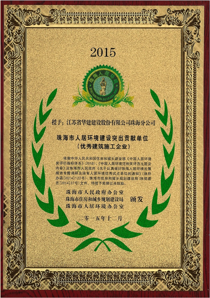 珠海市人居環(huán)境建設(shè)突出貢獻(xiàn)單位(優(yōu)秀建筑施工企業(yè))