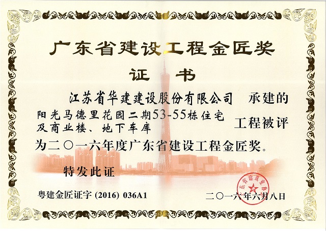 2016年度陽光馬德里53-55棟建設(shè)工程金匠獎