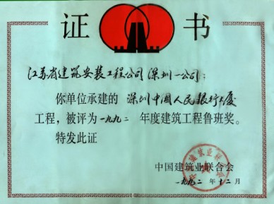 該工程位于深圳深南大道蔡屋圍地段,地上12層,地下室1層、高度48.6米,建筑面積21715平方米,于1987年1月破土動工,1989年8月竣工交付。工程由大型金庫、營業(yè)大廳、外匯交易所、電腦主機房、辦公室和多功能會議廳等組成,大廈前庭鋪設(shè)30級花崗石臺階,兩邊各設(shè)有50平方米的瀑布、噴泉,門庭內(nèi)外各4根8.6米高的巨型金屬圓柱,采用不銹鋼鏡面裝飾,墻面大理石天然絲紋拼接,大廳配有4部電梯。除照明外,還配有電視、電話、廣播音響、消防自動報警、自動噴灑滅火、1211氣體消防等先進裝置。工程先后榮獲1991年度深圳市優(yōu)質(zhì)樣板工程、江蘇省優(yōu)質(zhì)工程(金獎)、江蘇省名牌工程和1992年度中國建筑工程“魯班獎”。