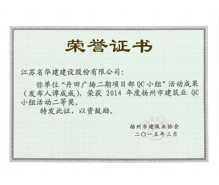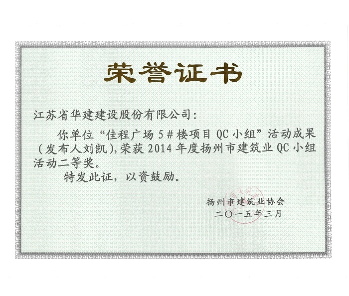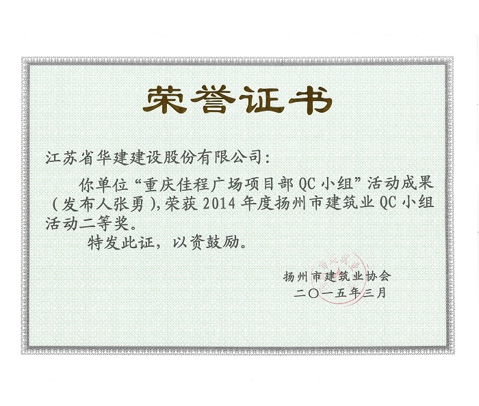 近日,揚州市建筑業協會發文表彰了2015年度全市建筑業QC小組活動成果獎,公司共有5項成果獲獎,其中,“孔令正QC小組”活動成果《剝蝕丘陵地貌多形截面鋼筋混凝土灌注樁施工新方法》榮獲一等獎,“佳程廣場5#樓項目QC小組”活動成果《提高核心筒筒體結構施工質量》、“重慶佳程廣場項目部QC小組”活動成果《提高現澆混凝土樓梯結構施工質量》、“丹田廣場二期項目部QC小組”活動成果《提高蒸壓加氣混凝土砌塊外墻合格率》榮獲二等獎,“馬賽公館項目部QC小組”活動成果《 提高耐磨金剛砂地面施工質量》榮獲三等獎。